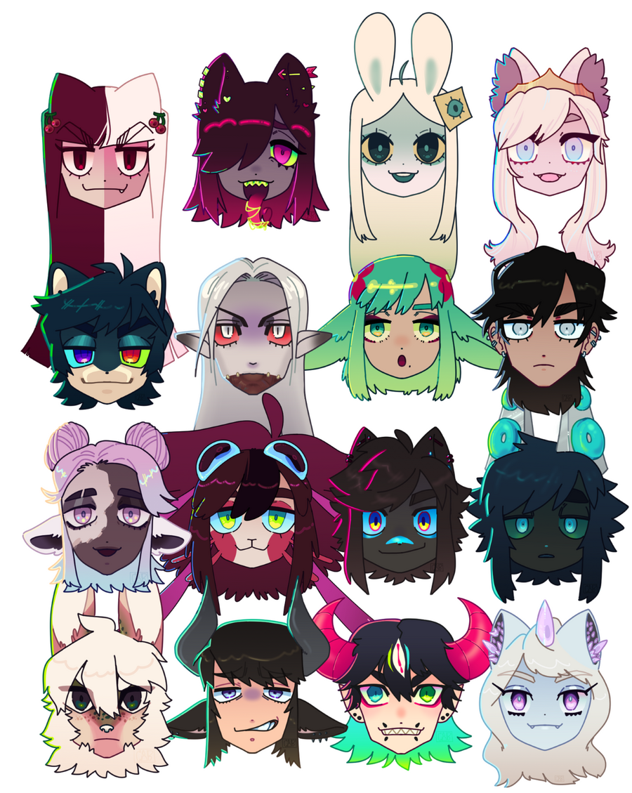 file size starts out at 500x500 px, 300 dpi, including negative space around head base. canvas is adjusted for ears, horns, and hair. hair length is drawn in full unless otherwise specified. this is so the user may zoom and crop as wanted for things such as icons or image previews